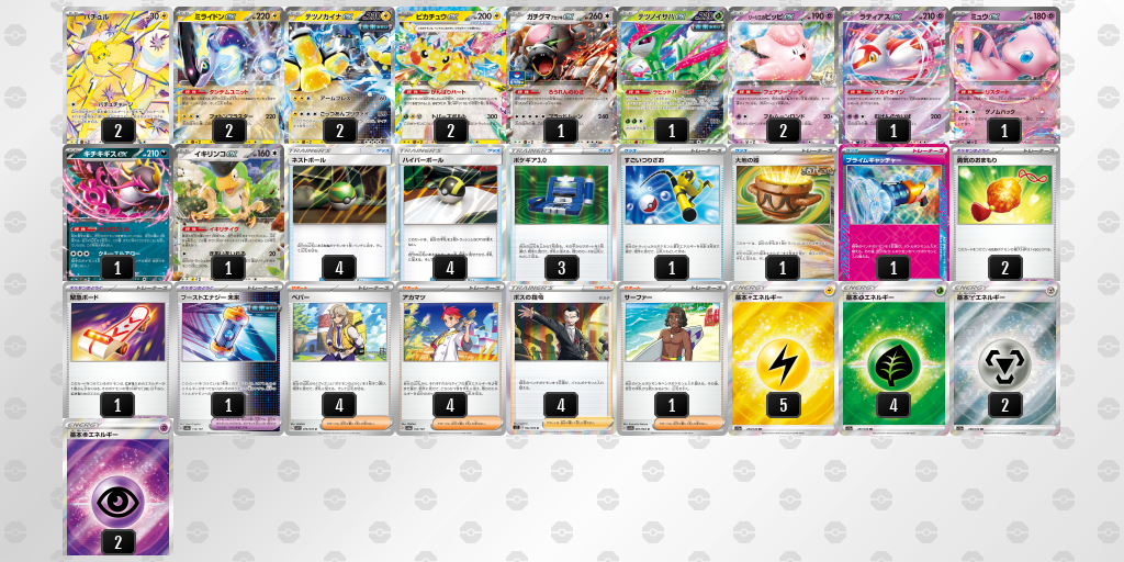 バチュルのエネルギー加速を起点に、多彩なアタッカーを早期に立ててサイドを取り切るデッキです。