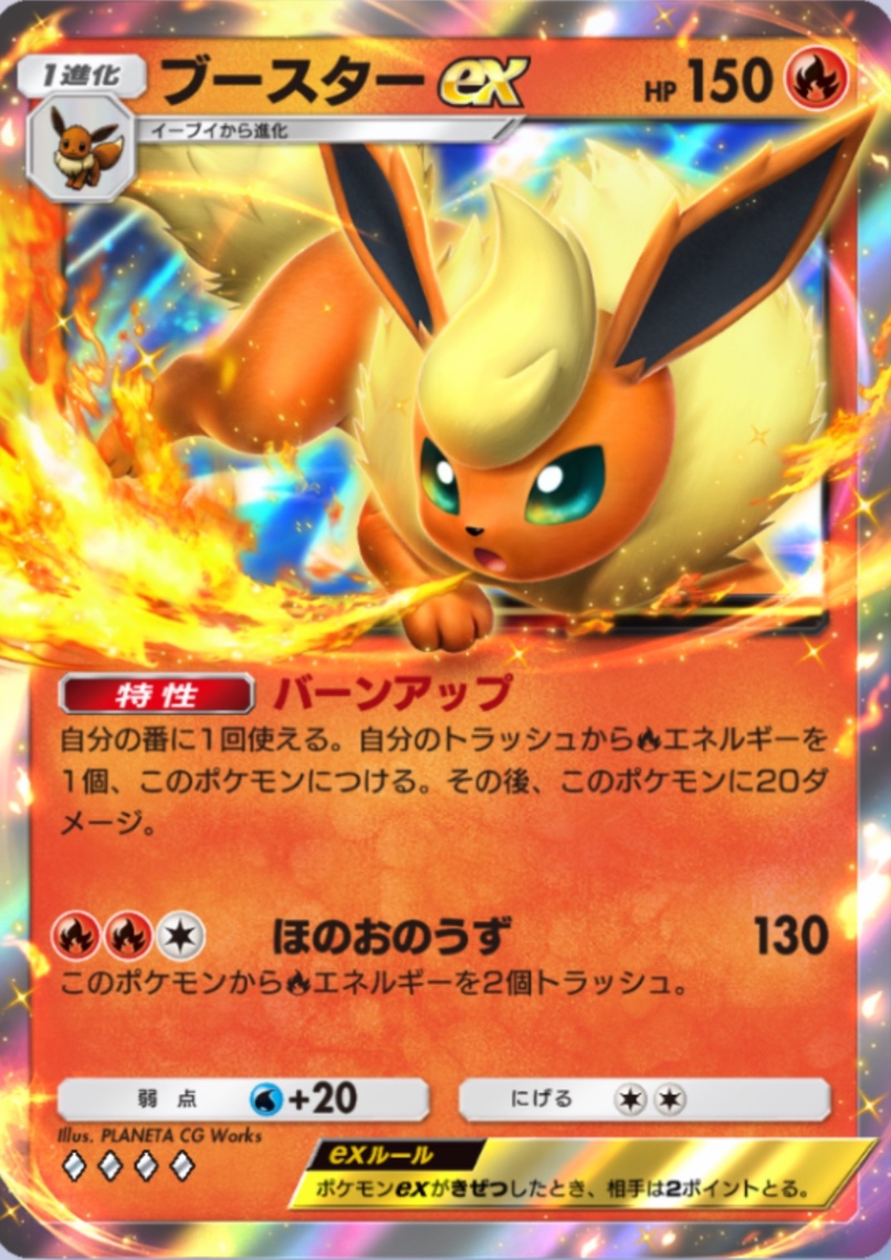 後攻ならリーフィアexの特性によるエネ加速を使い、2ターン目からブースターexで展開していくことも可能です。